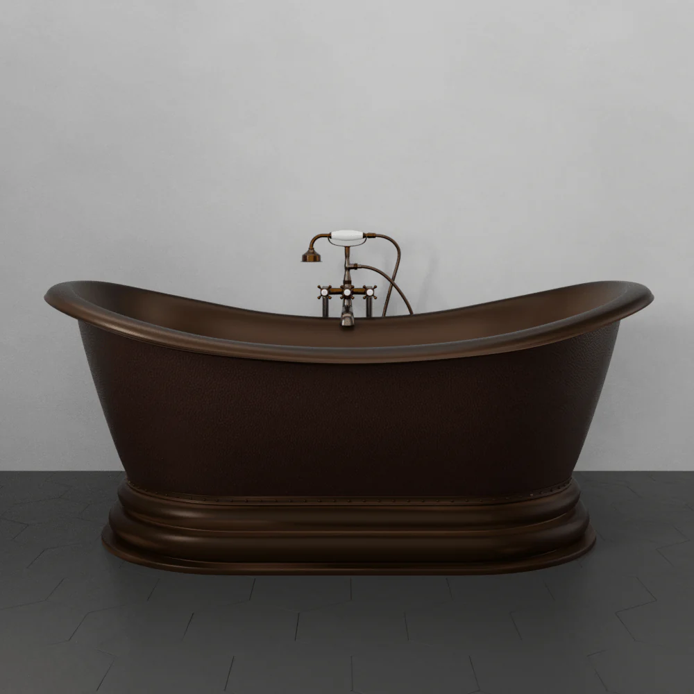 The 66" Lutts Copper Double-Slipper Roll-Top Pedestal Tub features handcrafted copper construction paired with a rich Mexican finish. Its double-slipper design supports comfortable reclining from either end, while the decorative pedestal base adds distinctive character. The tub can also be drilled for an overflow hole if desired, offering added installation flexibility.