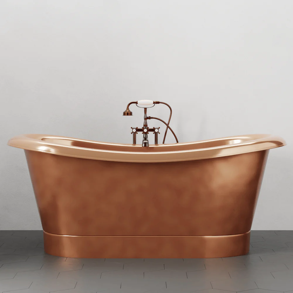 A striking contrast between the antique copper exterior and polished interior sets this copper tub apart from similar designs. The gradually sloping double-slipper walls enhance comfort for long soaks, while the clean, understated styling allows it to complement a wide range of master suites.