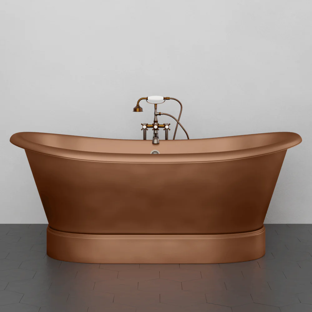 Because of its relatively subdued design and quality craftsmanship, this copper tub is a strong contender for nearly any bathroom project. The double-slipper shape allows bathers to recline comfortably from either side, offering both flexibility and comfort during use.