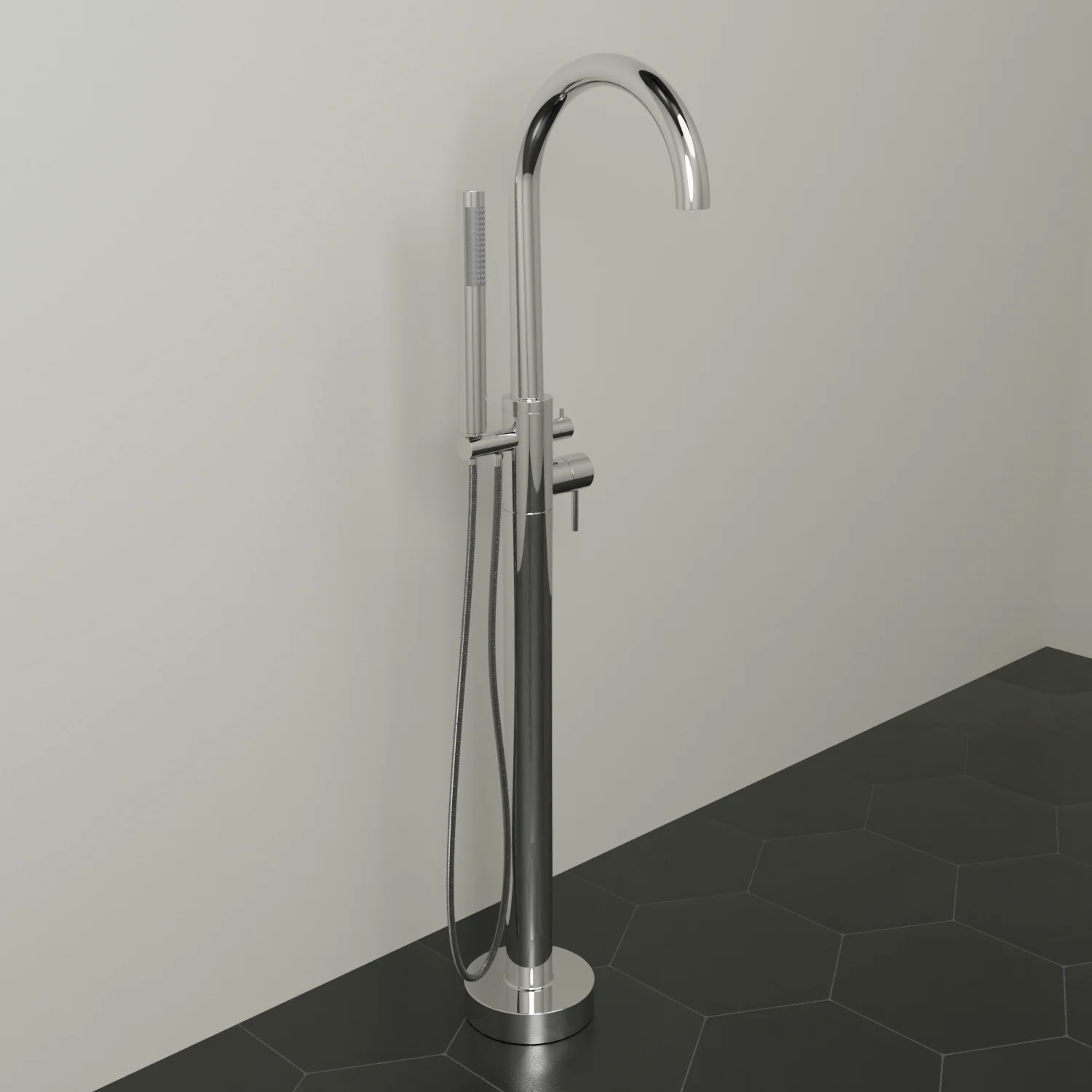 The graceful gooseneck spout and contemporary-style hand shower seamlessly blend for a freestanding faucet intended for use nearly anywhere. Featuring a diverter and sleek round body, this item will surely become high on anyone's wish list.