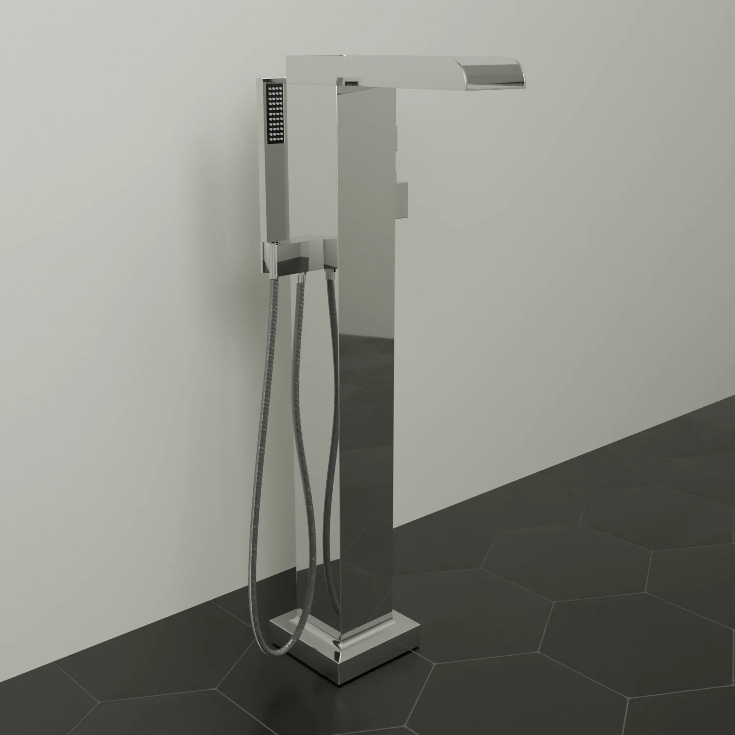 A distinctly modern design and thermostatically regulated water ensure this freestanding waterfall tub filler should find a place in any contemporary bath. The wand-style hand shower adds another dimension to the enchanting faucet.